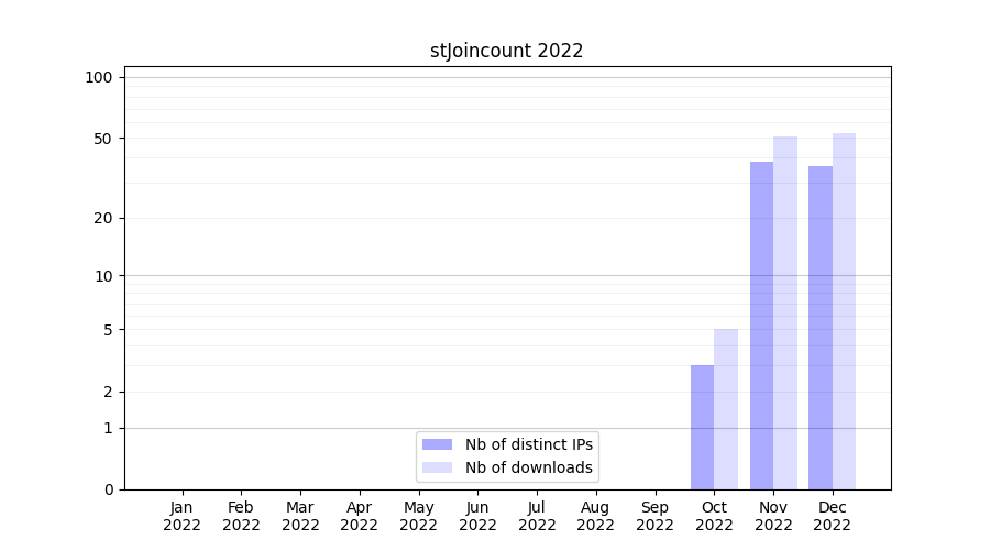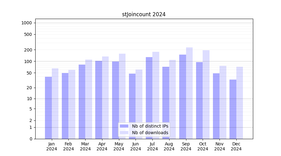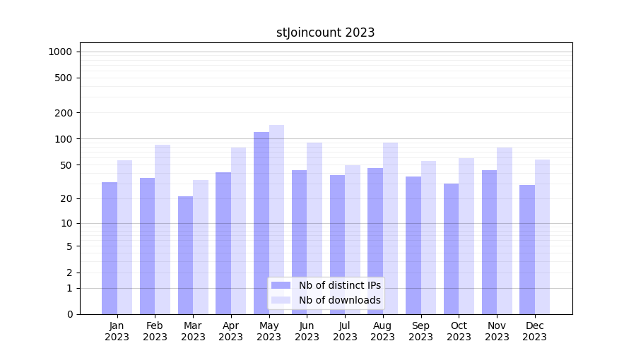 Number of downloads for software package stJoincount, year by year, from 2025 back to 2014 (years with no downloads are omitted):