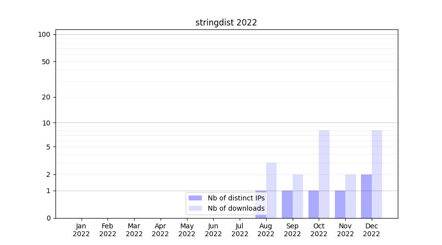 Number of downloads for software package stringdist, year by year, from 2025 back to 2014 (years with no downloads are omitted):