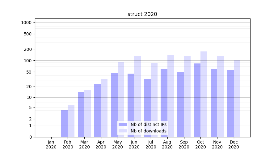 Number of downloads for software package struct, year by year, from 2025 back to 2014 (years with no downloads are omitted):