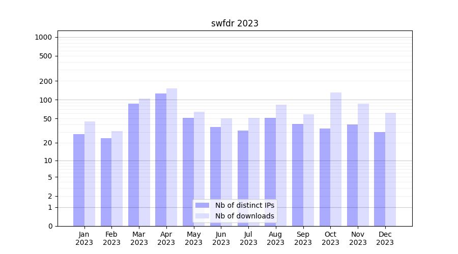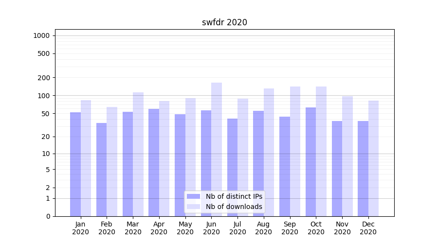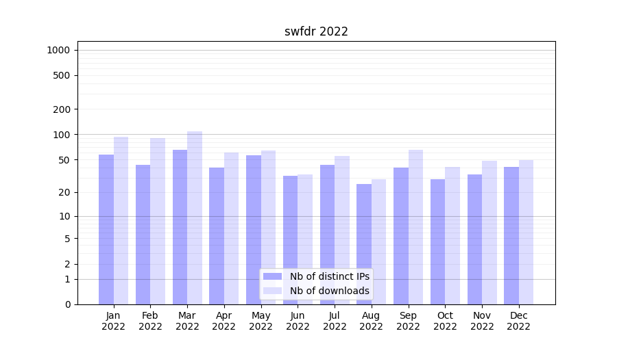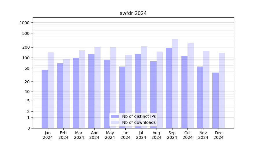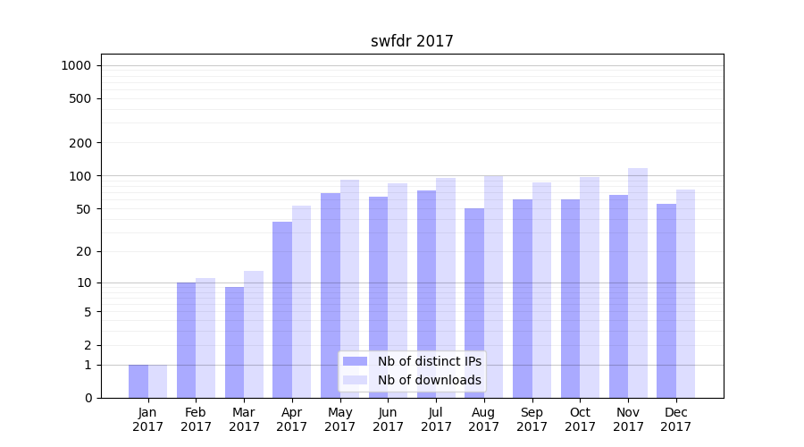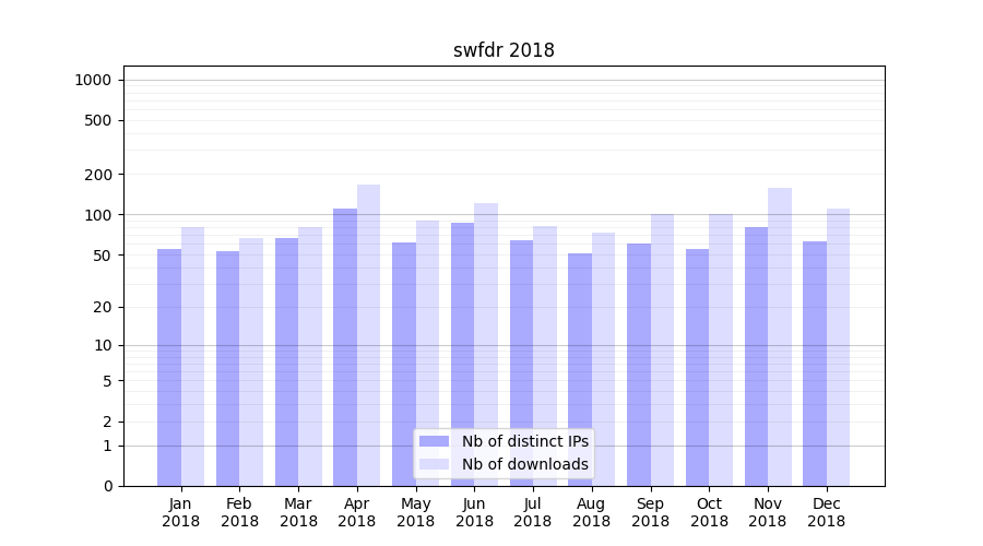 Number of downloads for software package swfdr, year by year, from 2025 back to 2014 (years with no downloads are omitted):