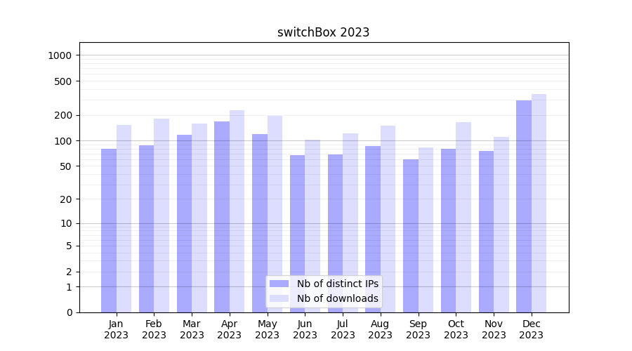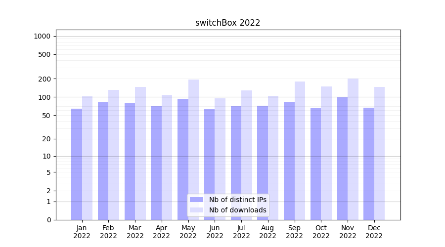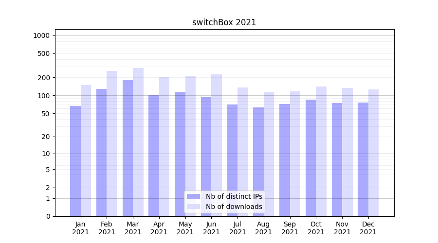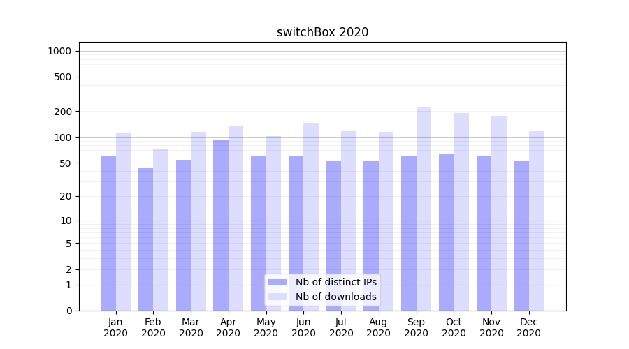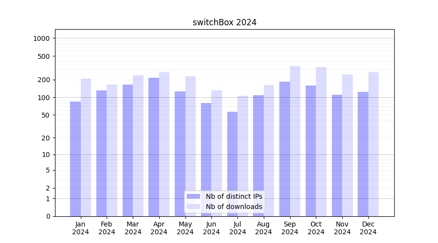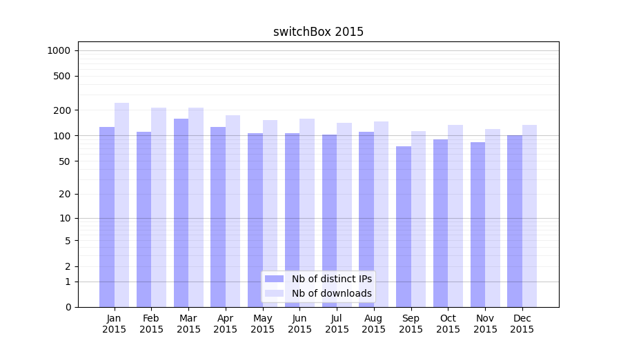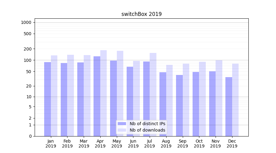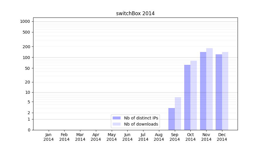 Number of downloads for software package switchBox, year by year, from 2025 back to 2014 (years with no downloads are omitted):