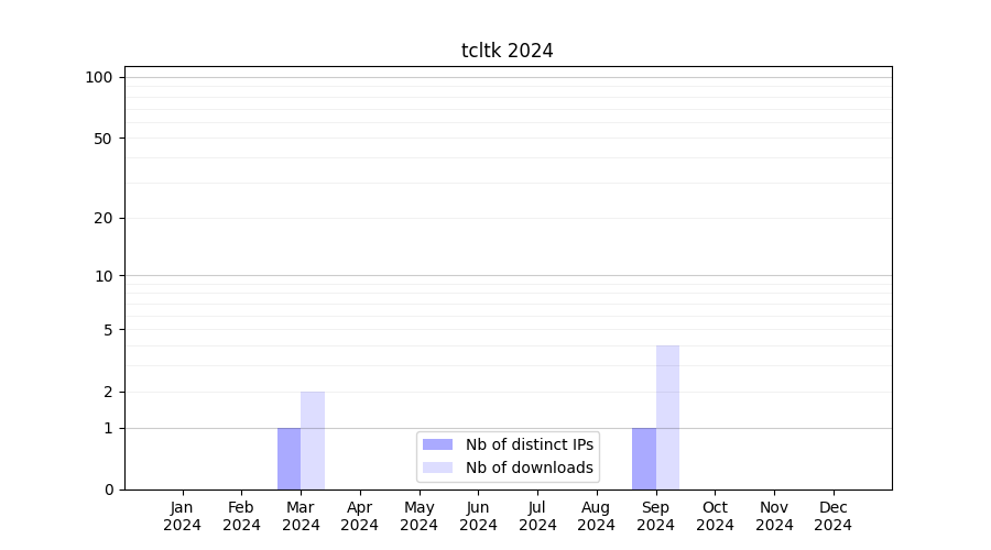 Number of downloads for software package tcltk, year by year, from 2025 back to 2014 (years with no downloads are omitted):
