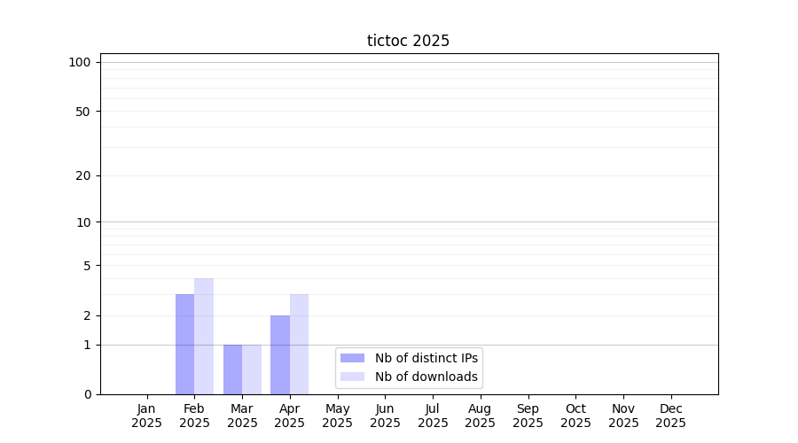Number of downloads for software package tictoc, year by year, from 2025 back to 2014 (years with no downloads are omitted):