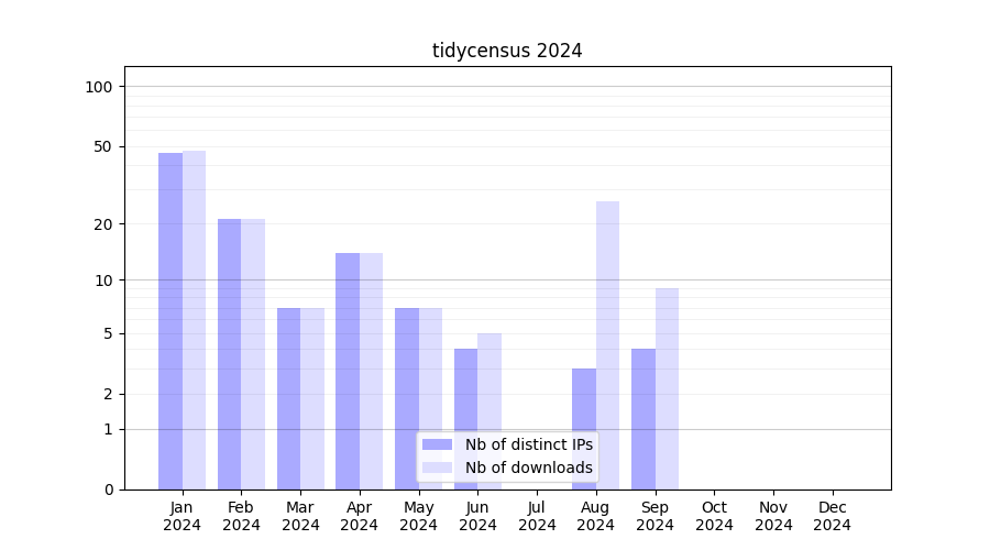 Number of downloads for software package tidycensus, year by year, from 2025 back to 2014 (years with no downloads are omitted):