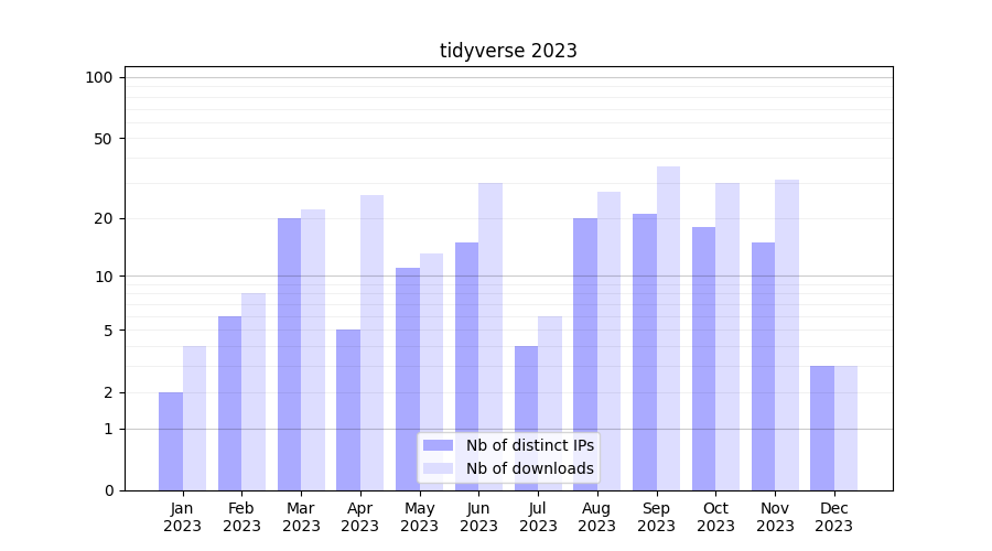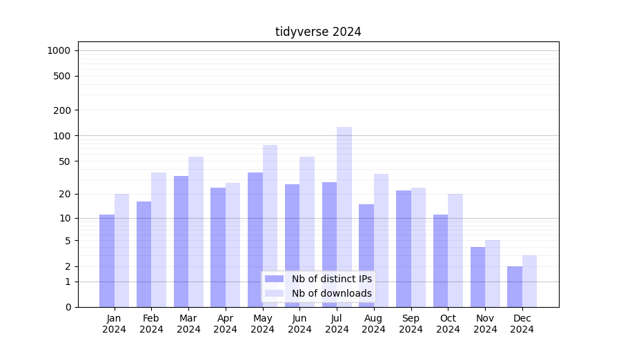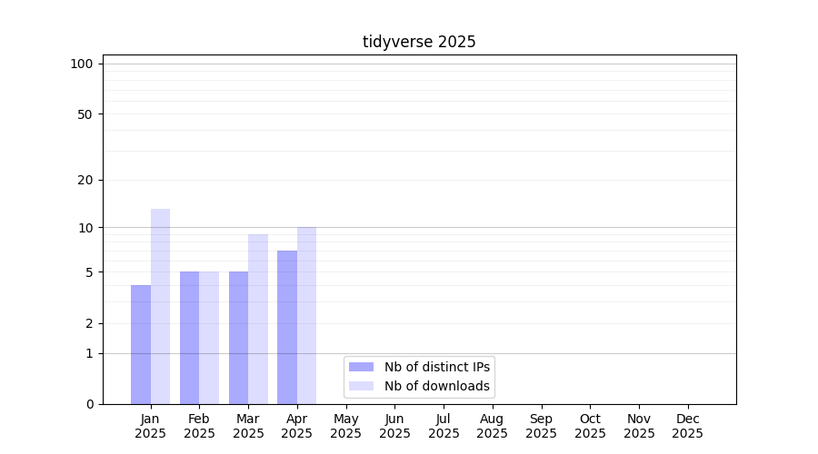 Number of downloads for software package tidyverse, year by year, from 2025 back to 2014 (years with no downloads are omitted):
