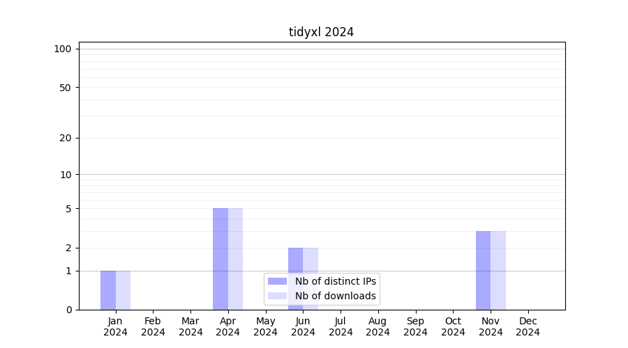 Number of downloads for software package tidyxl, year by year, from 2025 back to 2014 (years with no downloads are omitted):