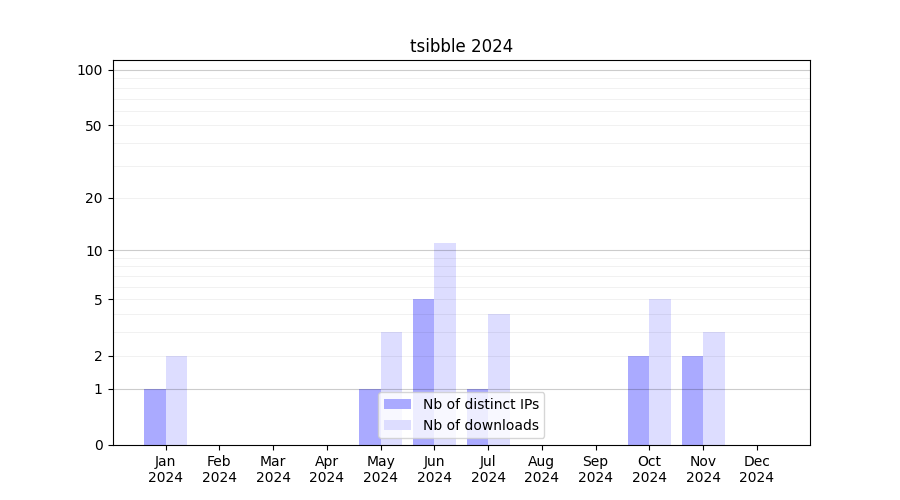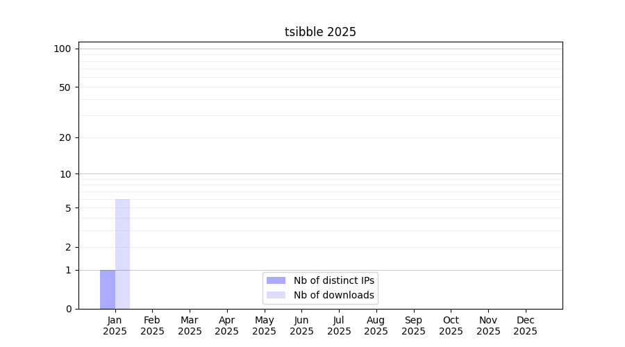 Number of downloads for software package tsibble, year by year, from 2025 back to 2014 (years with no downloads are omitted):