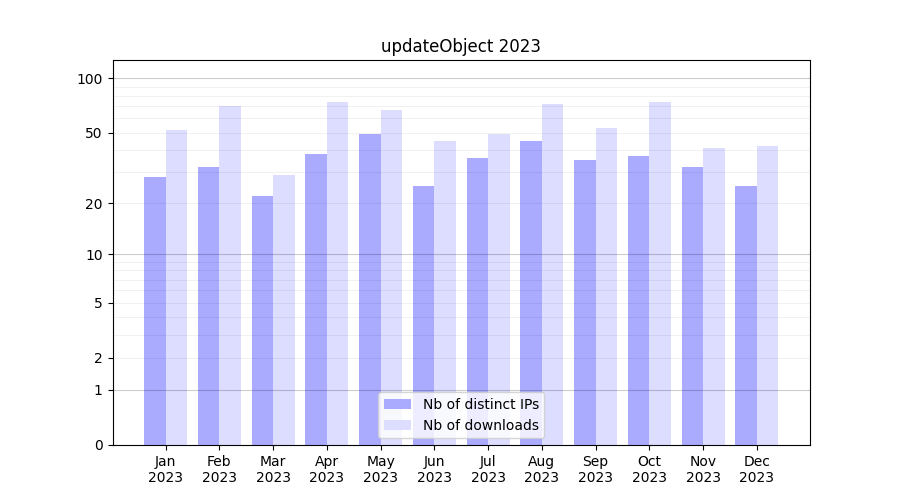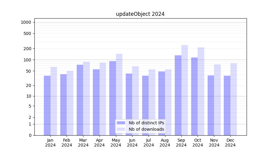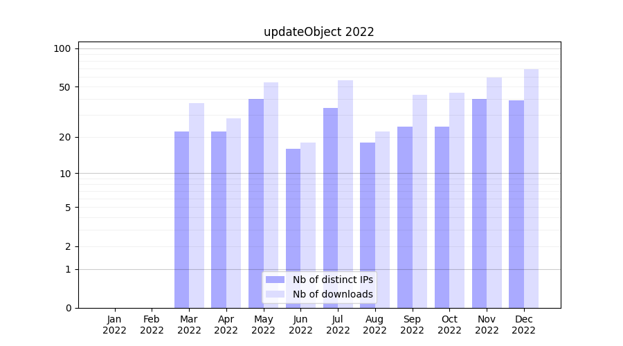 Number of downloads for software package updateObject, year by year, from 2025 back to 2014 (years with no downloads are omitted):