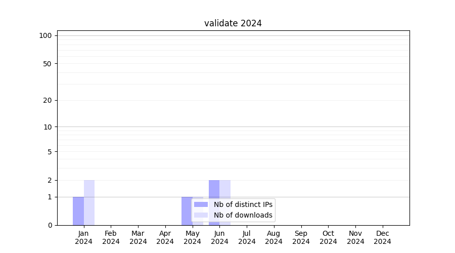 Number of downloads for software package validate, year by year, from 2025 back to 2014 (years with no downloads are omitted):