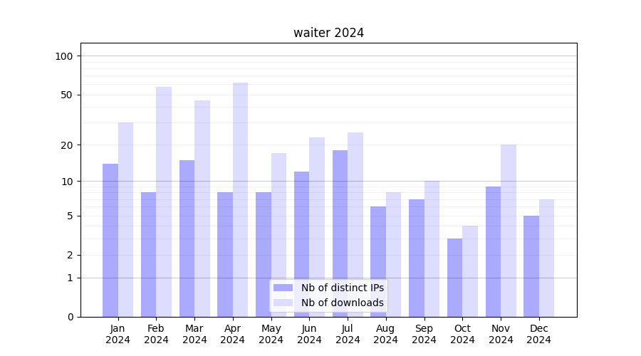 Number of downloads for software package waiter, year by year, from 2025 back to 2014 (years with no downloads are omitted):