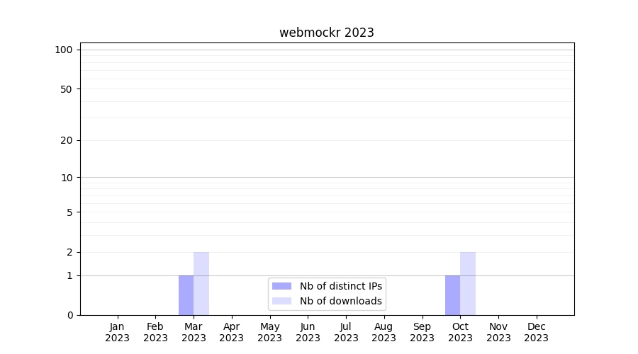Number of downloads for software package webmockr, year by year, from 2025 back to 2014 (years with no downloads are omitted):