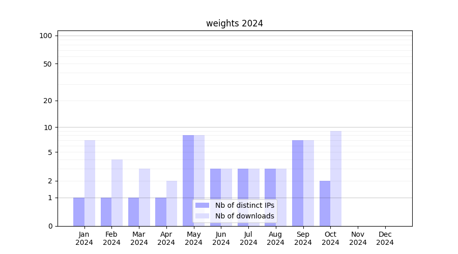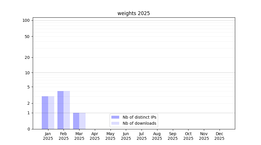 Number of downloads for software package weights, year by year, from 2025 back to 2014 (years with no downloads are omitted):