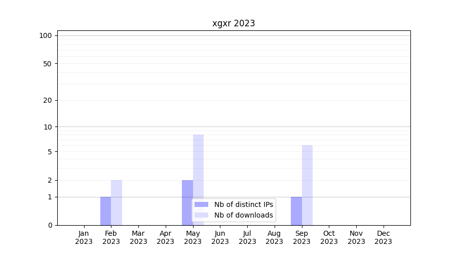 Number of downloads for software package xgxr, year by year, from 2025 back to 2014 (years with no downloads are omitted):
