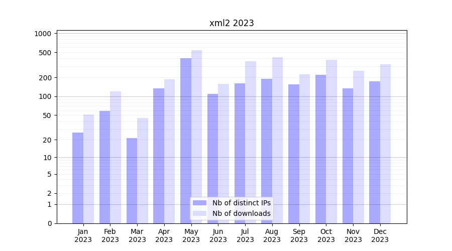 Number of downloads for software package xml2, year by year, from 2025 back to 2014 (years with no downloads are omitted):