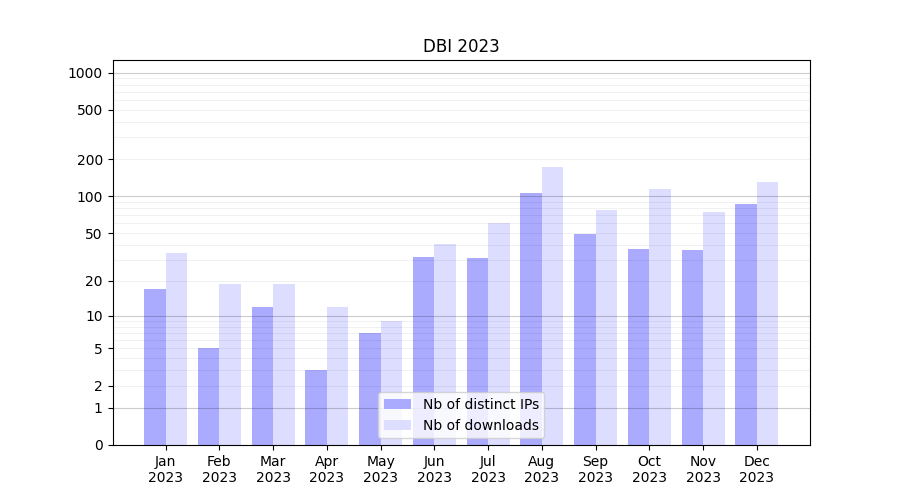 Number of downloads for annotation package DBI, year by year, from 2025 back to 2014 (years with no downloads are omitted):