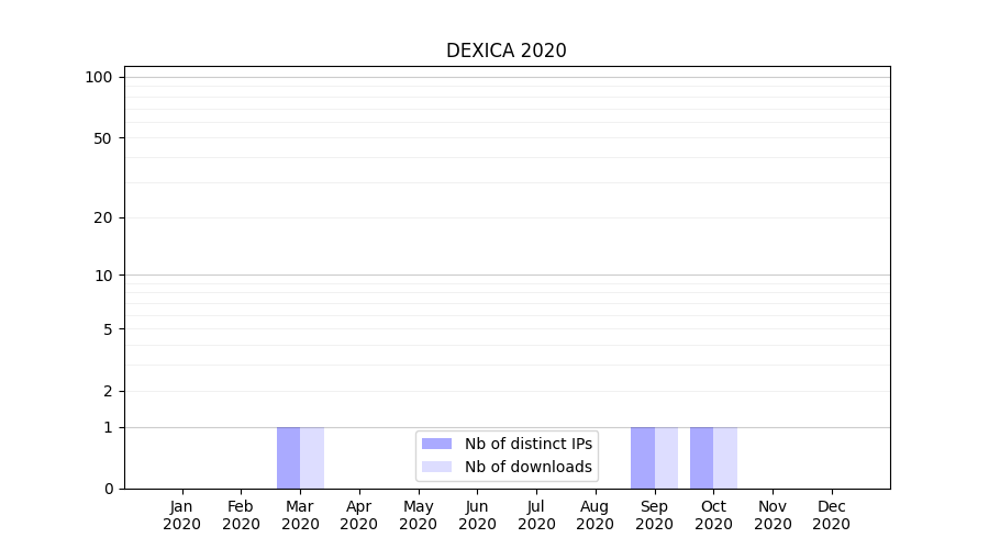 Number of downloads for annotation package DEXICA, year by year, from 2025 back to 2014 (years with no downloads are omitted):