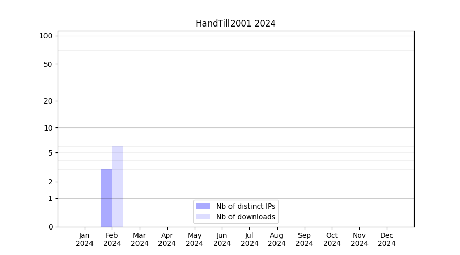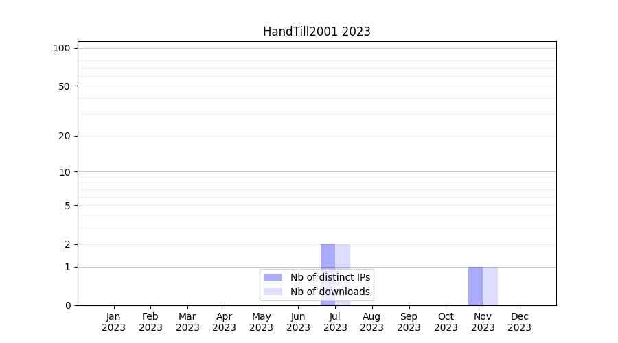Number of downloads for annotation package HandTill2001, year by year, from 2025 back to 2014 (years with no downloads are omitted):