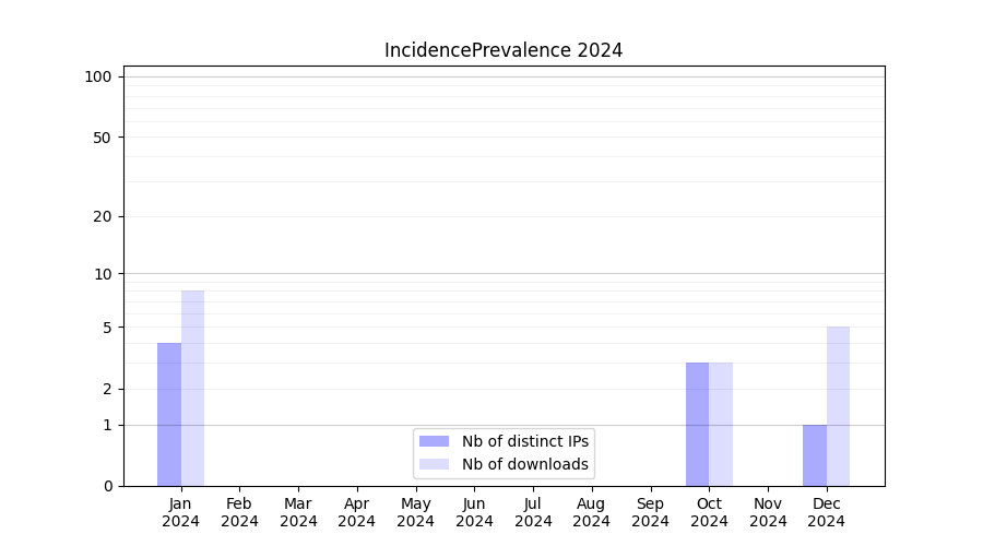 Number of downloads for annotation package IncidencePrevalence, year by year, from 2025 back to 2014 (years with no downloads are omitted):