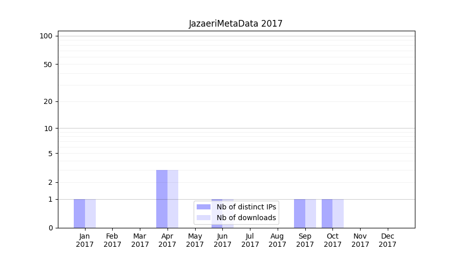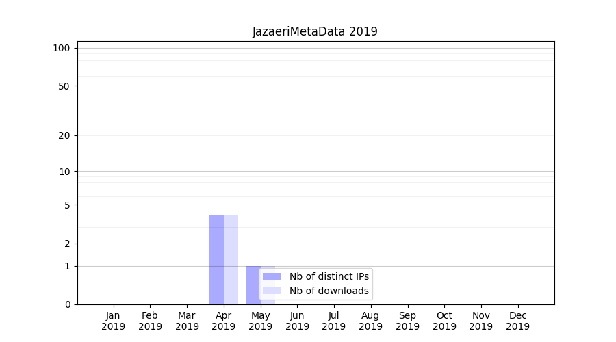 Number of downloads for annotation package JazaeriMetaData, year by year, from 2025 back to 2014 (years with no downloads are omitted):