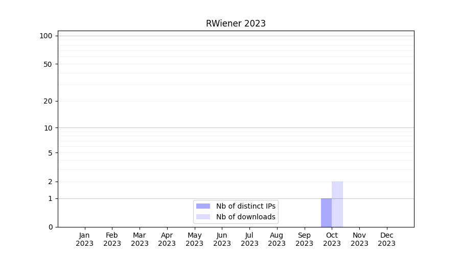 Number of downloads for annotation package RWiener, year by year, from 2025 back to 2014 (years with no downloads are omitted):