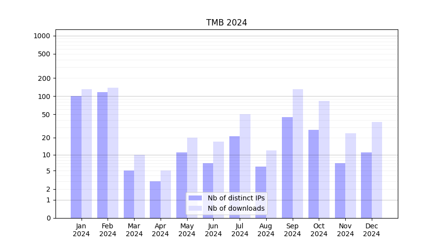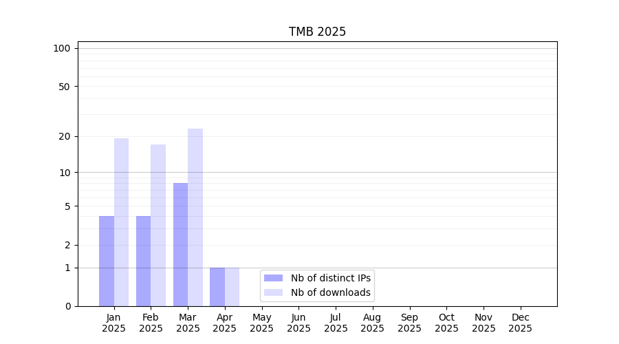 Number of downloads for annotation package TMB, year by year, from 2025 back to 2014 (years with no downloads are omitted):