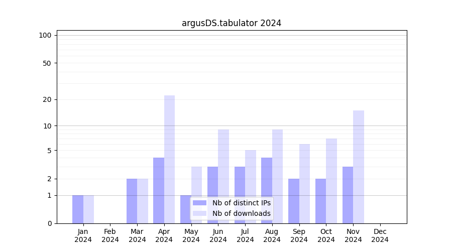 Number of downloads for annotation package argusDS.tabulator, year by year, from 2025 back to 2014 (years with no downloads are omitted):