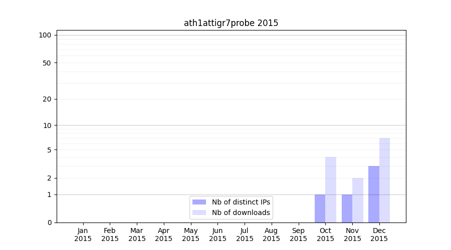 Number of downloads for annotation package ath1attigr7probe, year by year, from 2025 back to 2014 (years with no downloads are omitted):