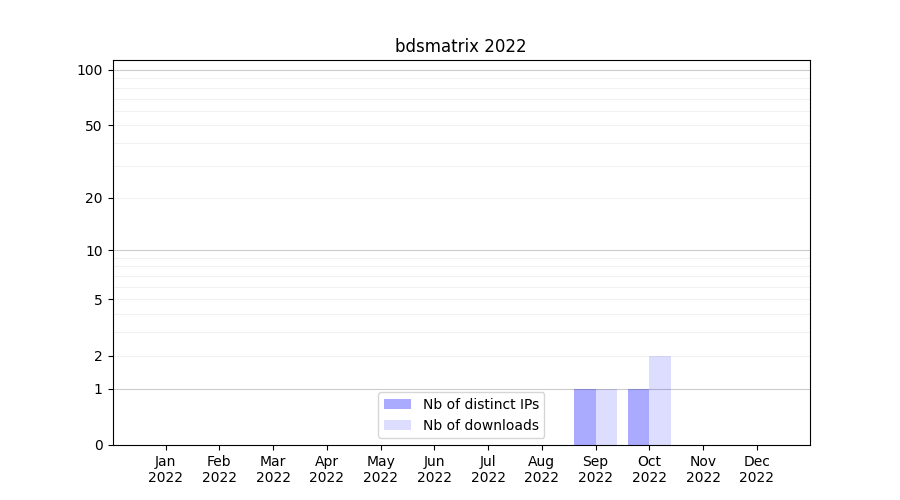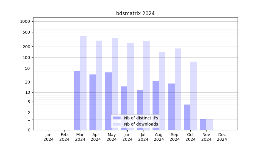 Number of downloads for annotation package bdsmatrix, year by year, from 2025 back to 2014 (years with no downloads are omitted):