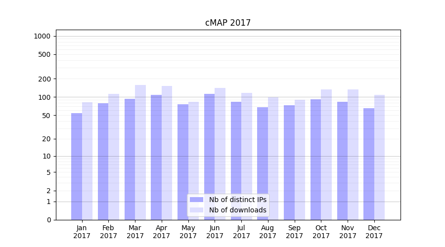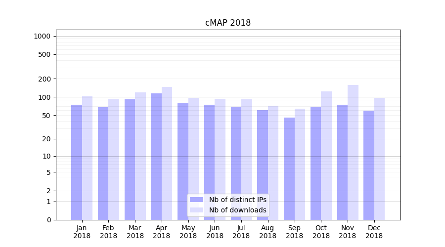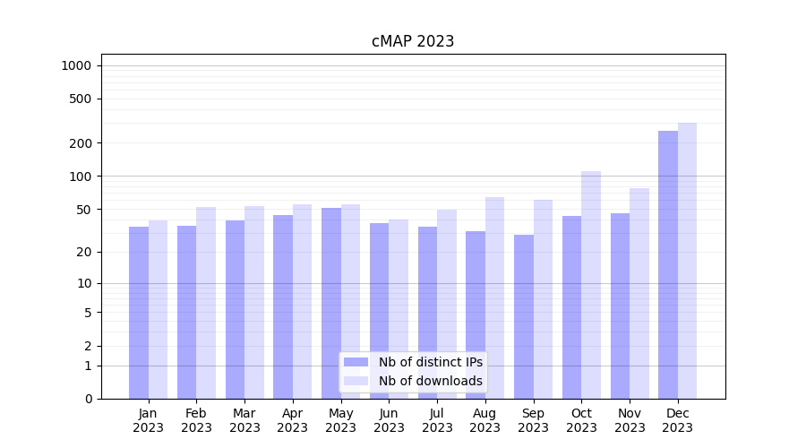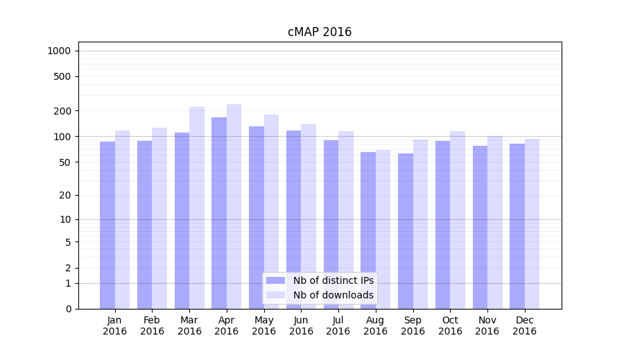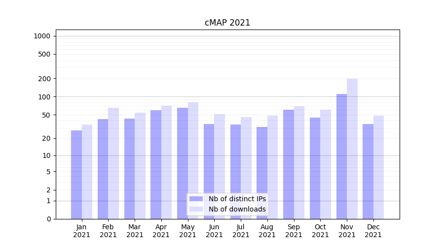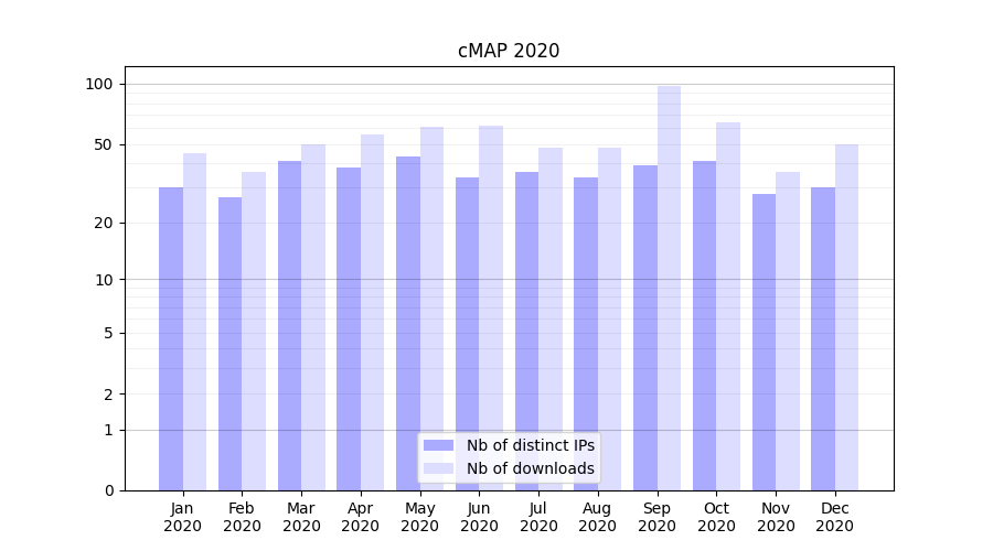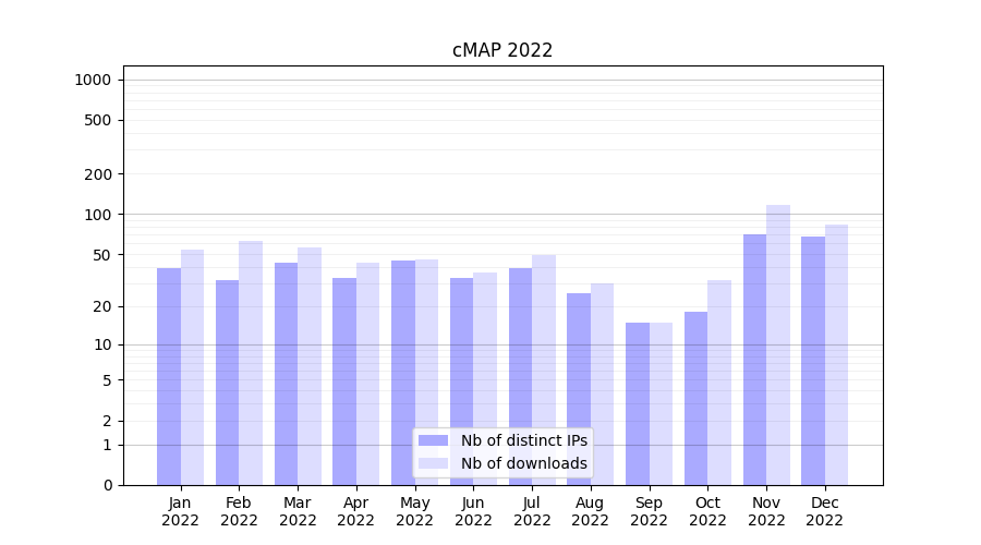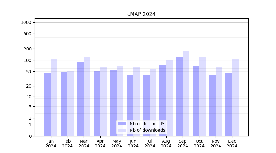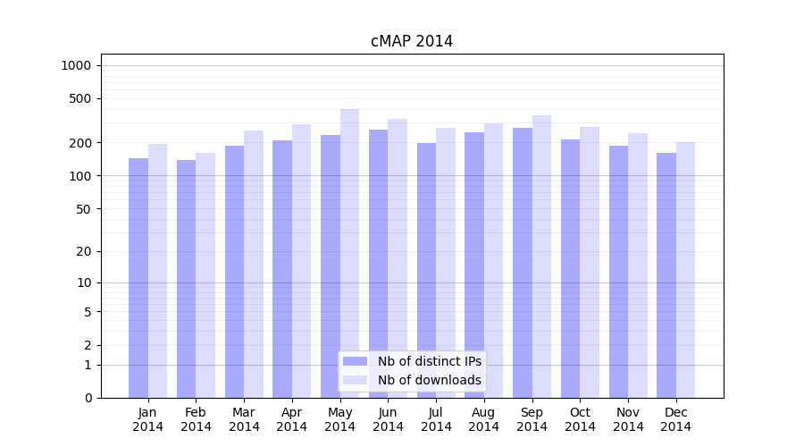 Number of downloads for annotation package cMAP, year by year, from 2025 back to 2014 (years with no downloads are omitted):