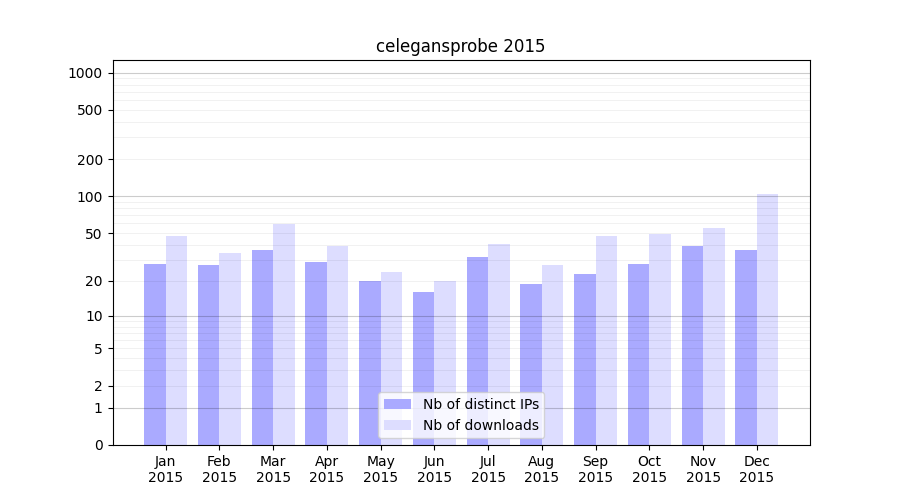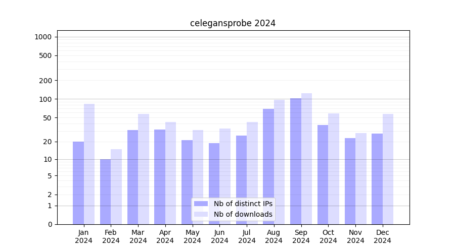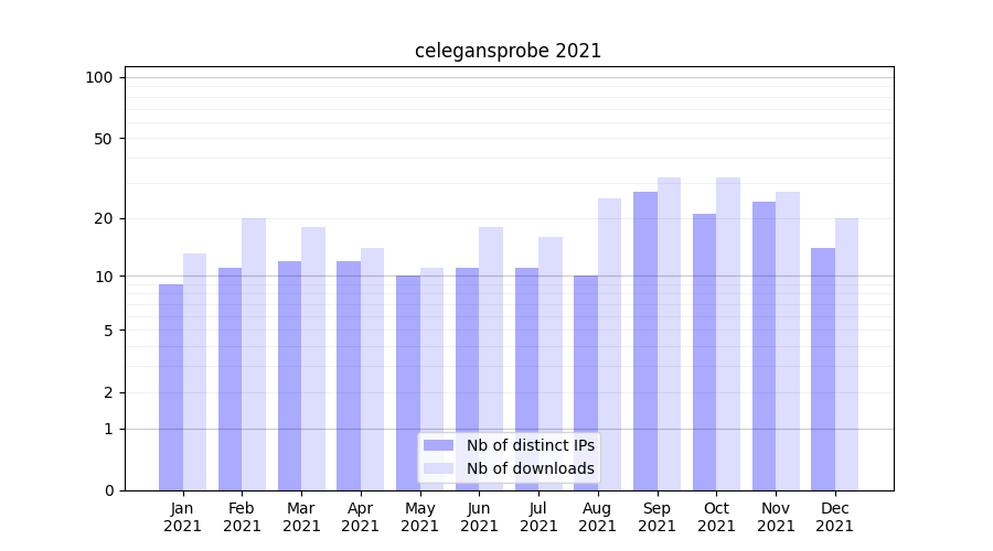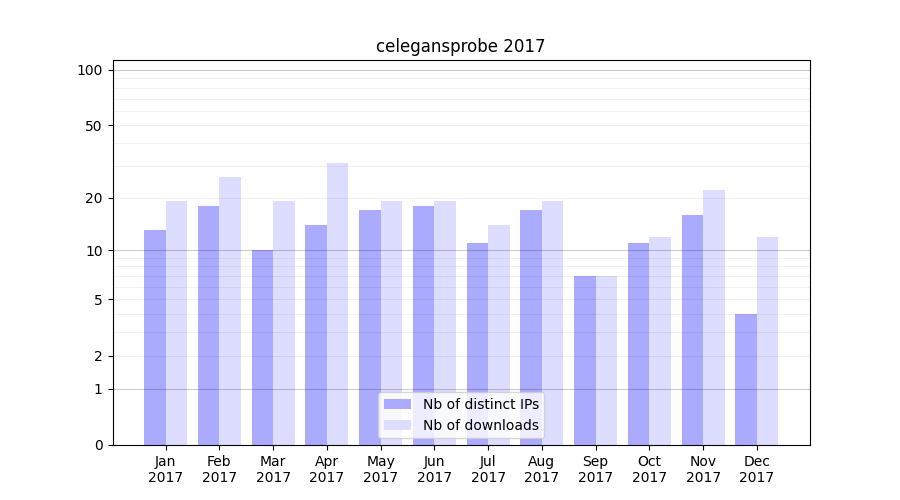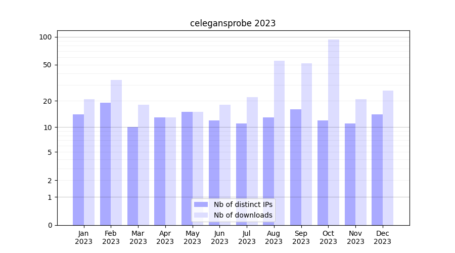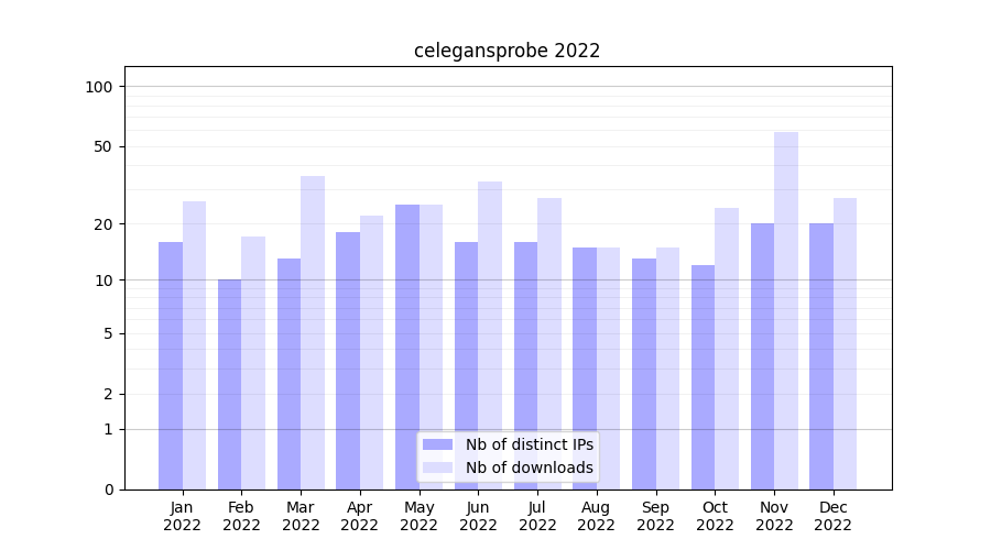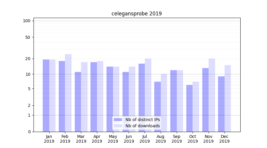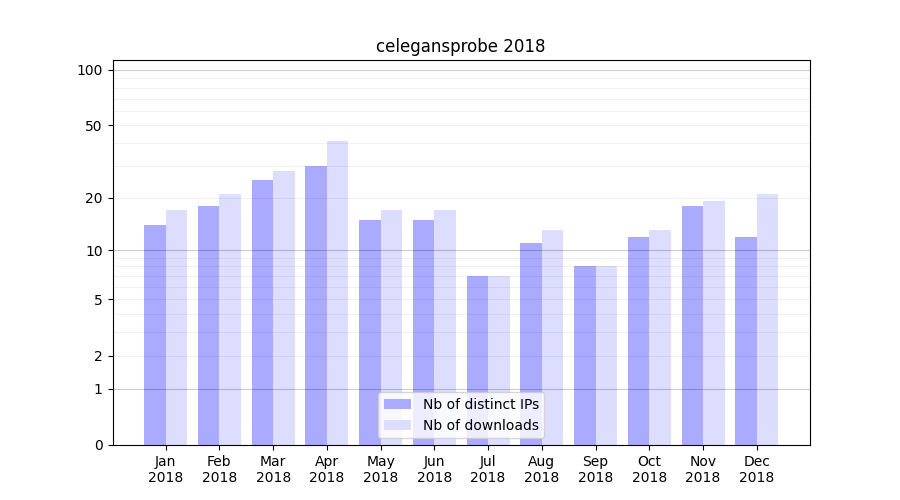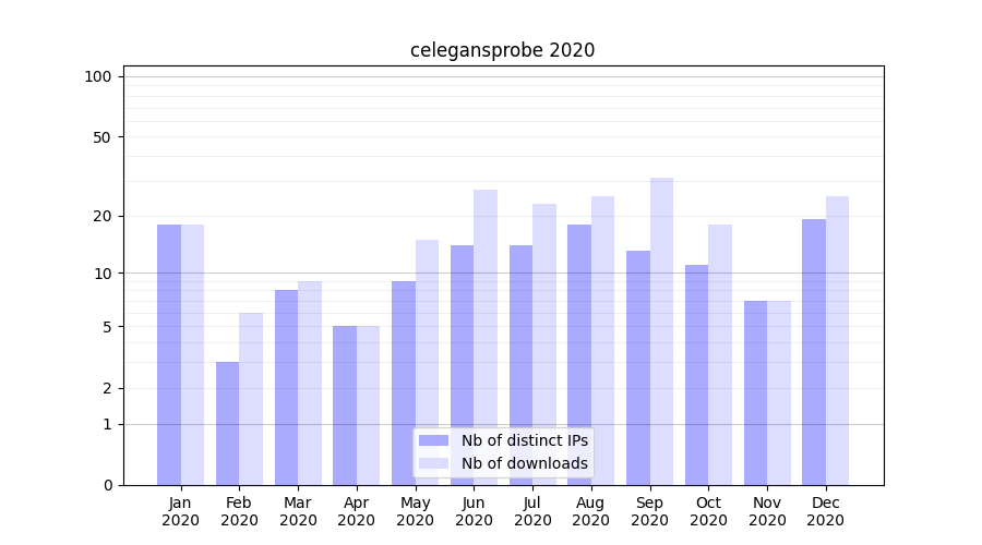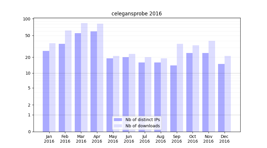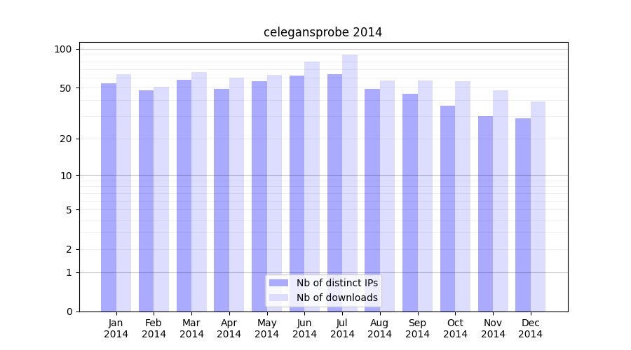 Number of downloads for annotation package celegansprobe, year by year, from 2025 back to 2014 (years with no downloads are omitted):