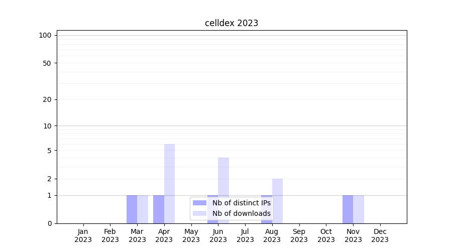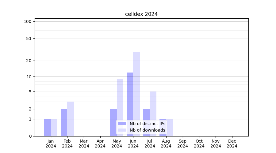 Number of downloads for annotation package celldex, year by year, from 2025 back to 2014 (years with no downloads are omitted):