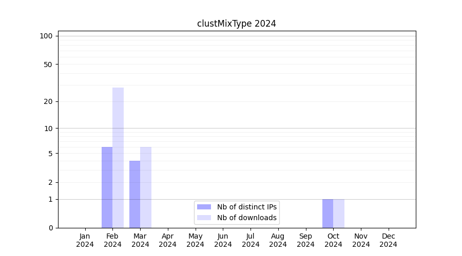 Number of downloads for annotation package clustMixType, year by year, from 2025 back to 2014 (years with no downloads are omitted):