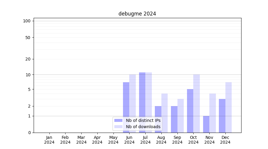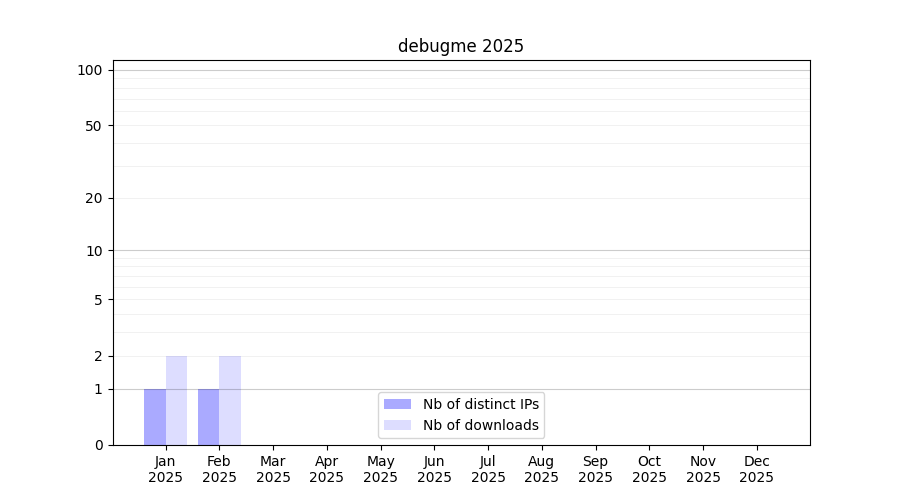 Number of downloads for annotation package debugme, year by year, from 2025 back to 2014 (years with no downloads are omitted):