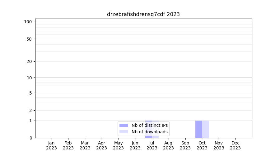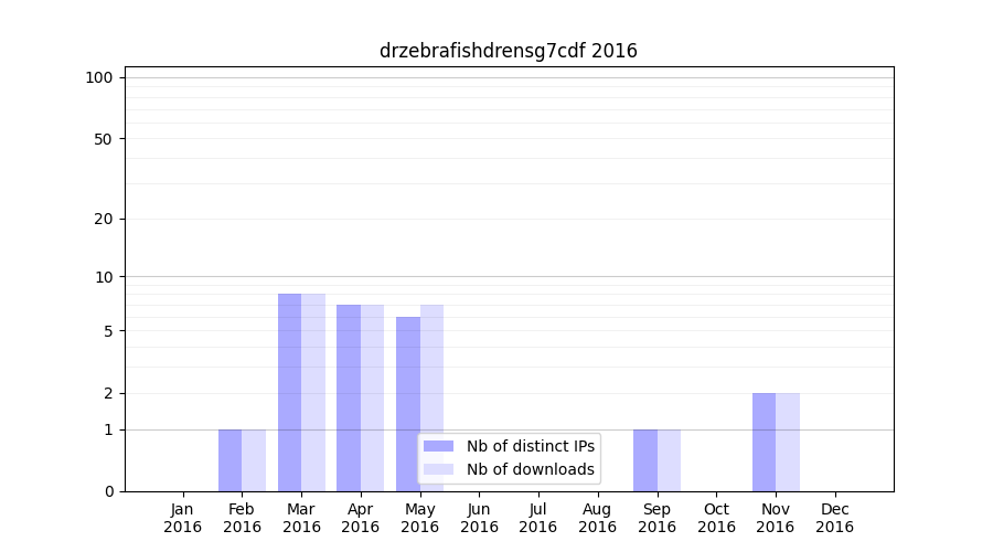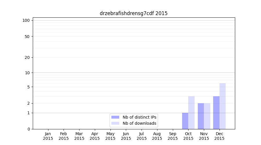 Number of downloads for annotation package drzebrafishdrensg7cdf, year by year, from 2025 back to 2014 (years with no downloads are omitted):
