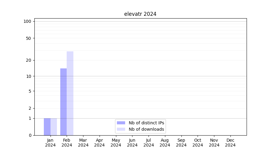 Number of downloads for annotation package elevatr, year by year, from 2025 back to 2014 (years with no downloads are omitted):