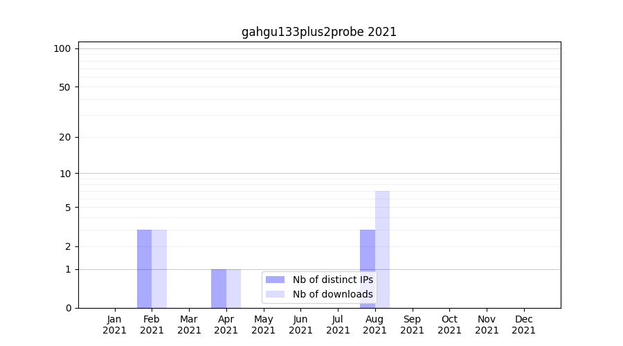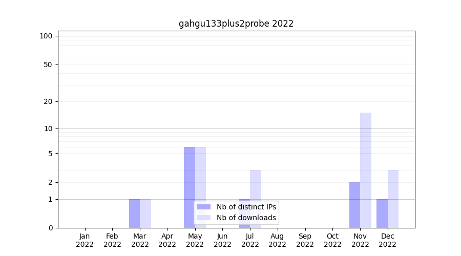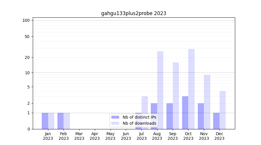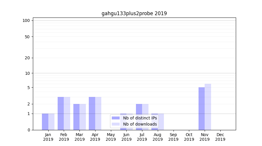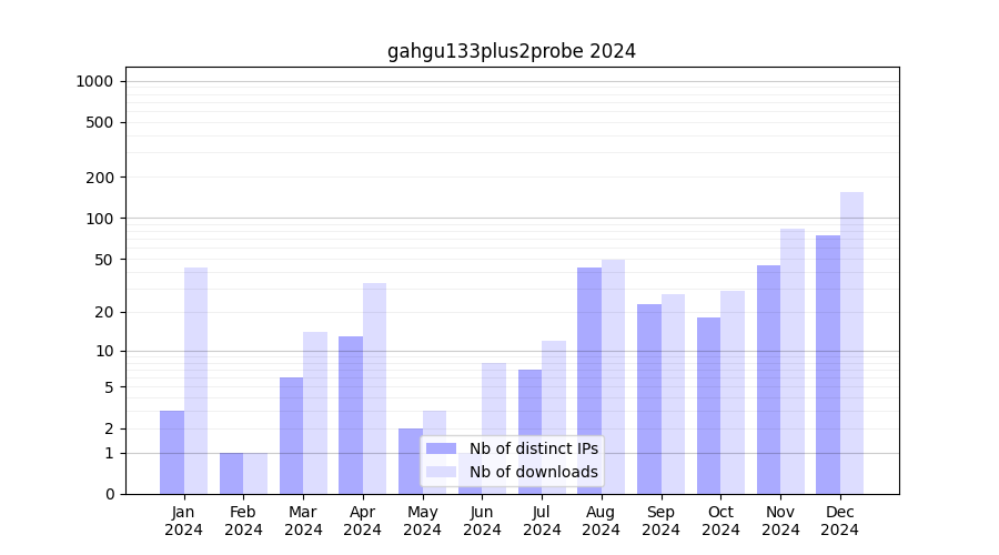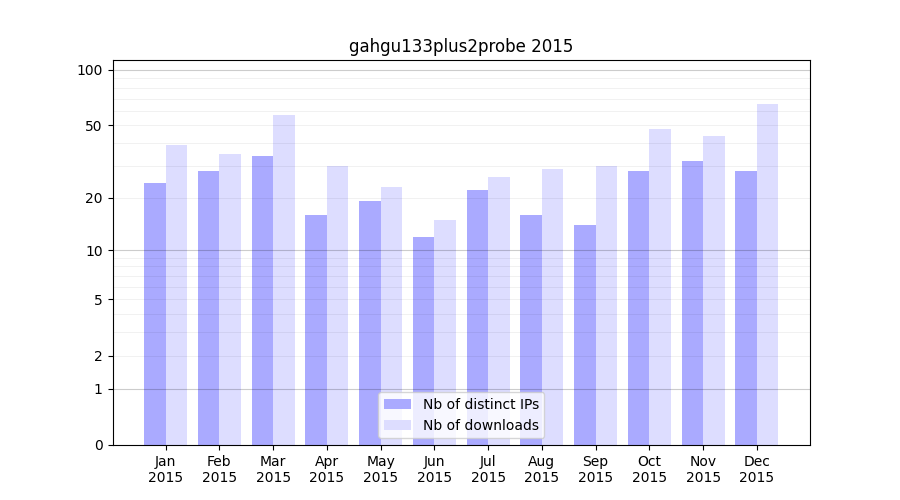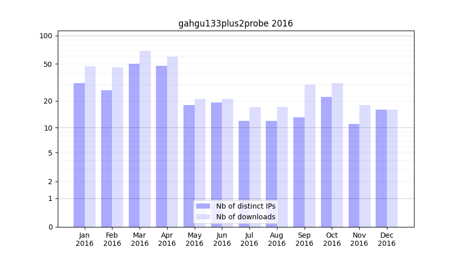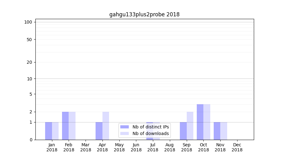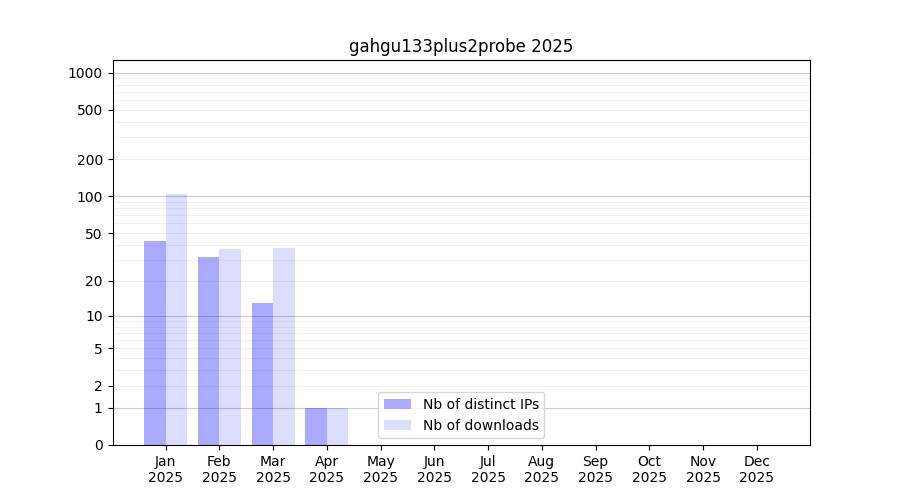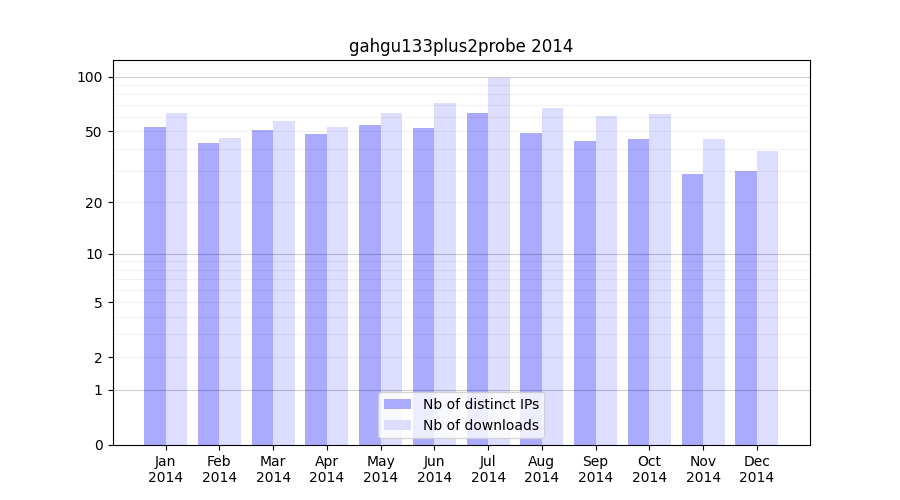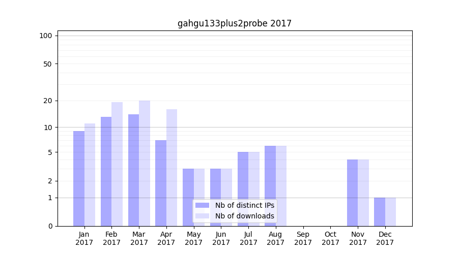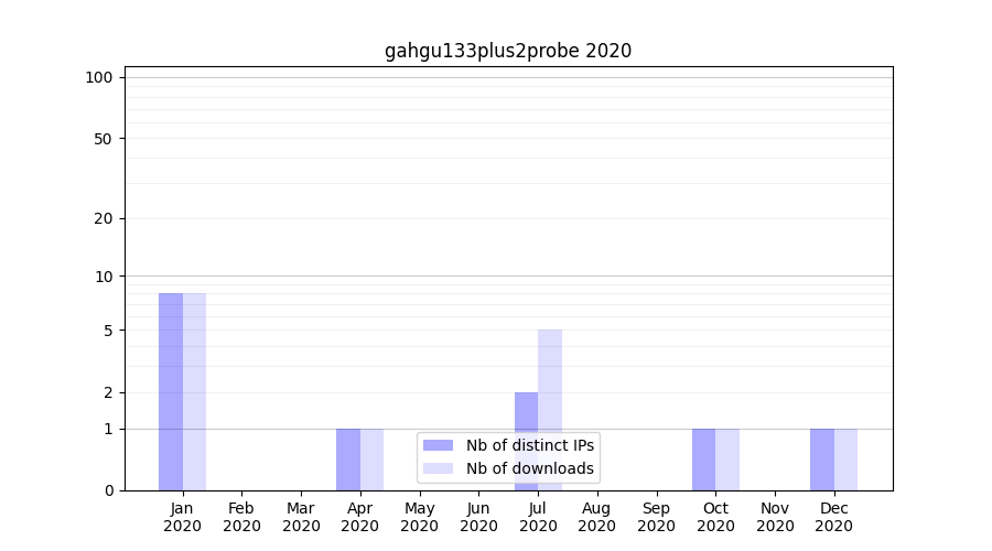 Number of downloads for annotation package gahgu133plus2probe, year by year, from 2025 back to 2014 (years with no downloads are omitted):