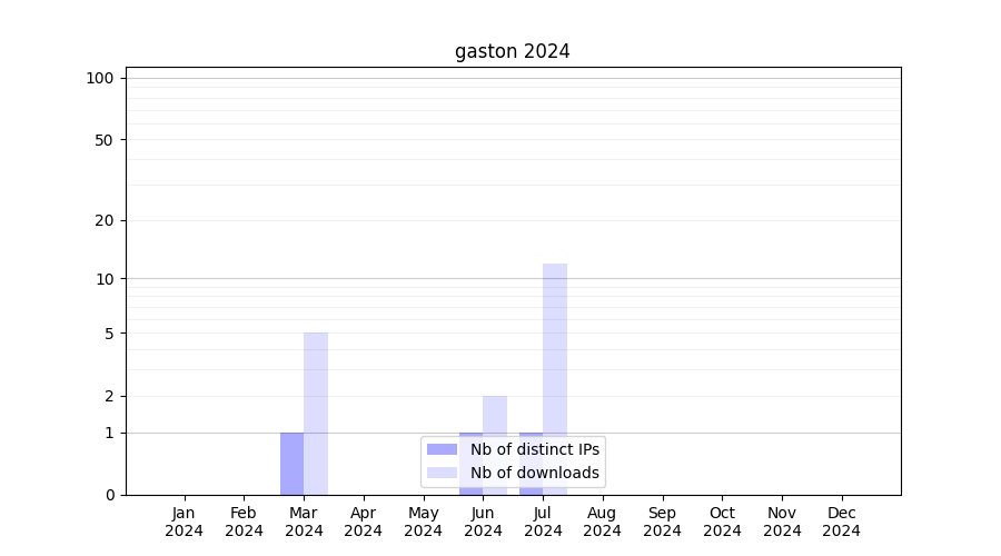 Number of downloads for annotation package gaston, year by year, from 2025 back to 2014 (years with no downloads are omitted):