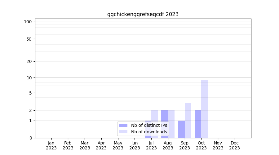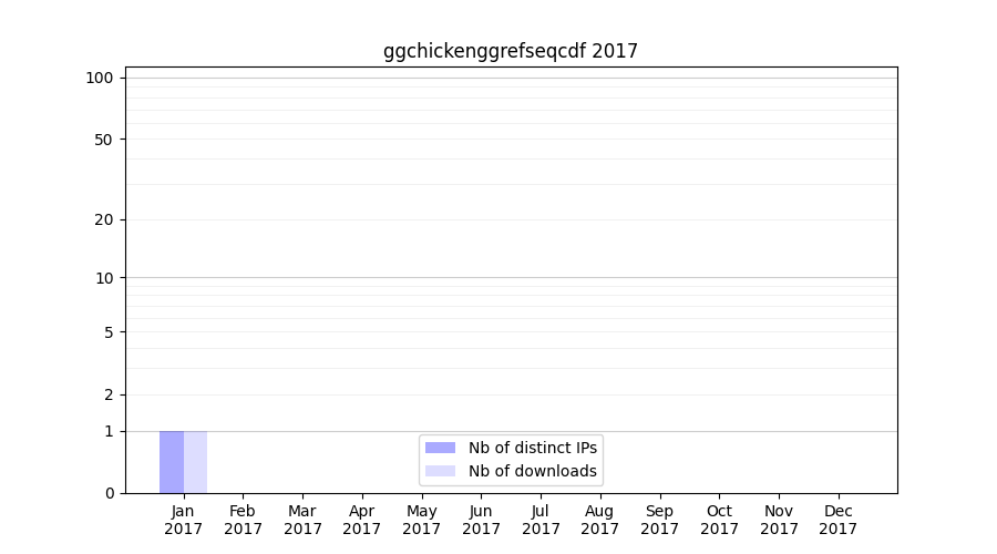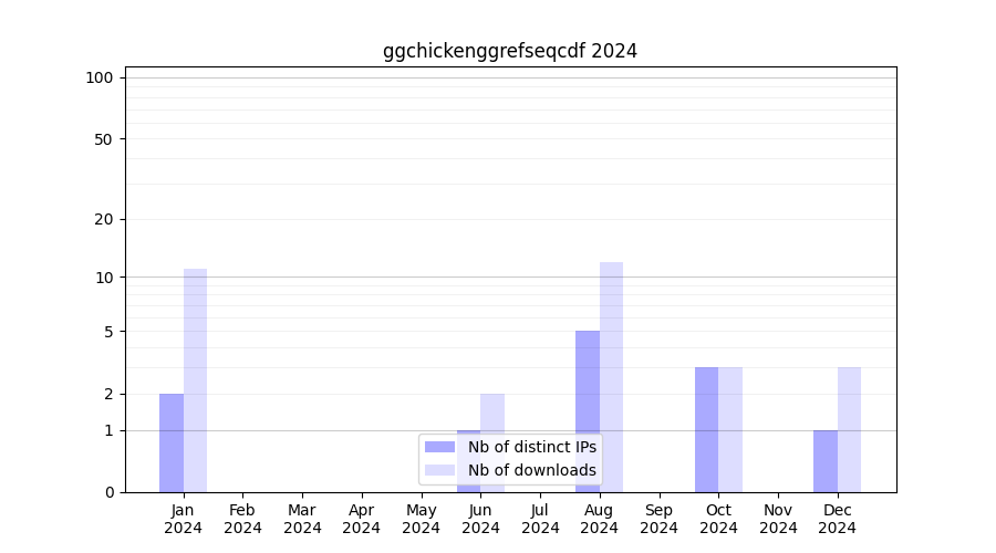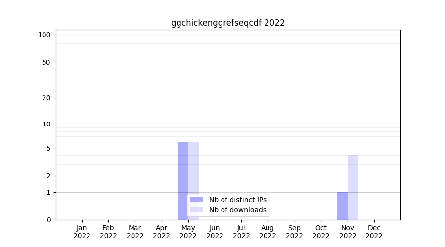 Number of downloads for annotation package ggchickenggrefseqcdf, year by year, from 2025 back to 2014 (years with no downloads are omitted):