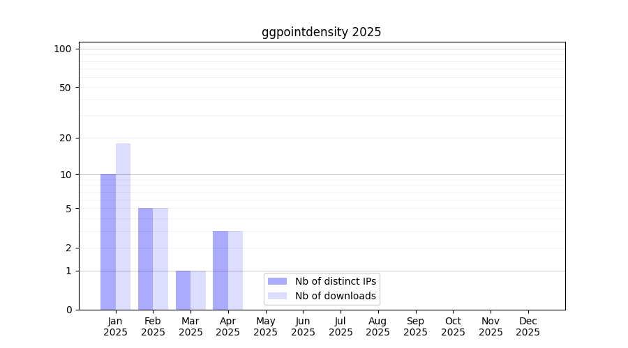 Number of downloads for annotation package ggpointdensity, year by year, from 2025 back to 2014 (years with no downloads are omitted):