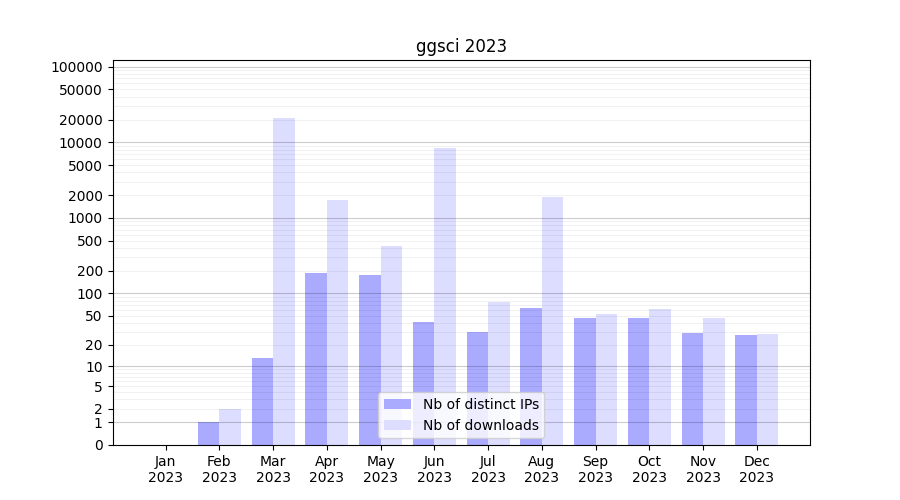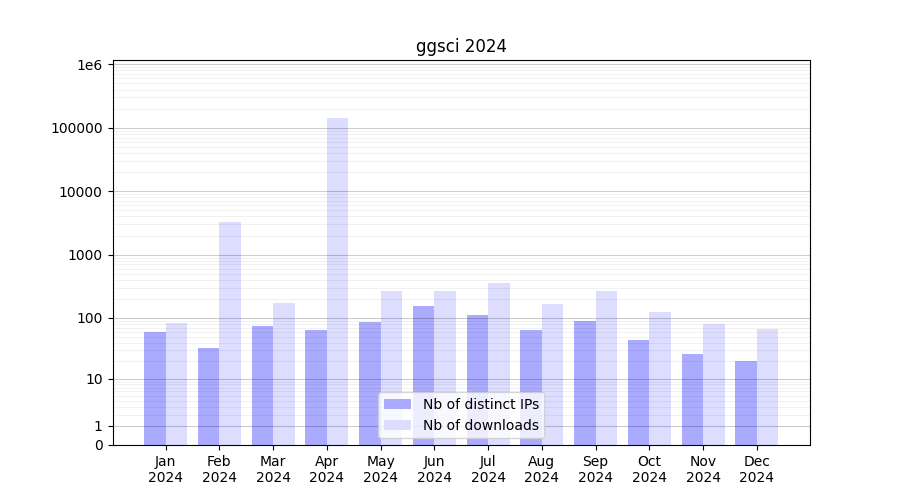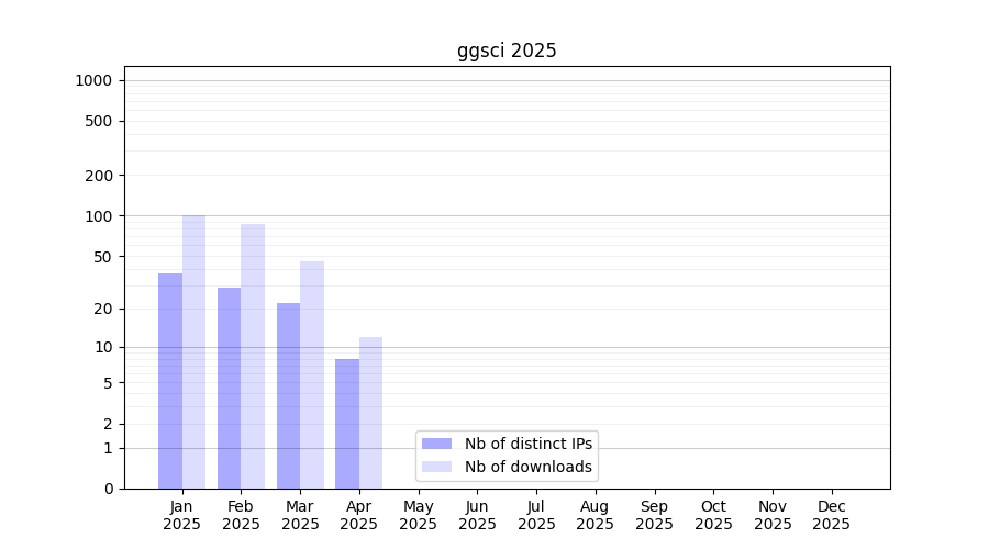 Number of downloads for annotation package ggsci, year by year, from 2025 back to 2014 (years with no downloads are omitted):