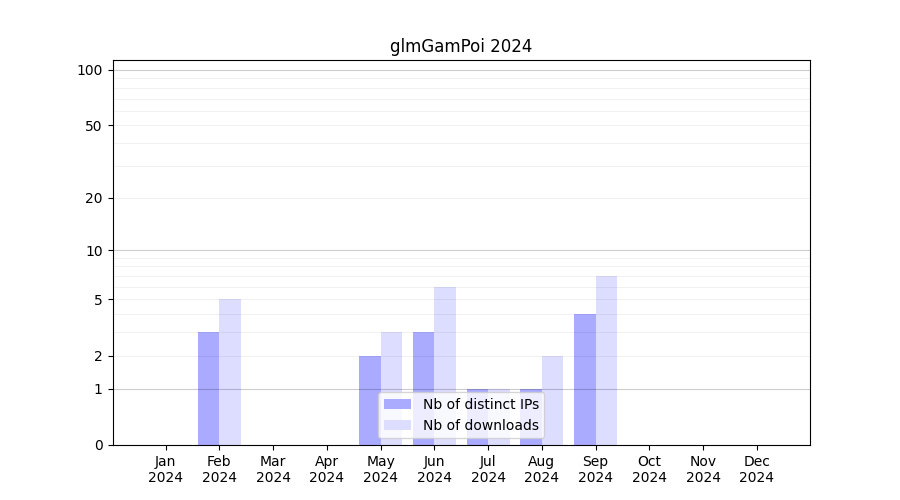 Number of downloads for annotation package glmGamPoi, year by year, from 2025 back to 2014 (years with no downloads are omitted):