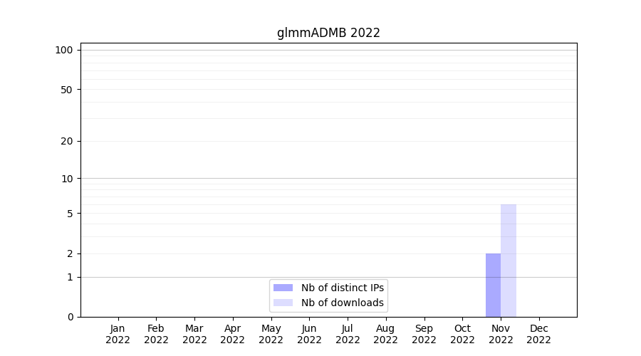 Number of downloads for annotation package glmmADMB, year by year, from 2025 back to 2014 (years with no downloads are omitted):