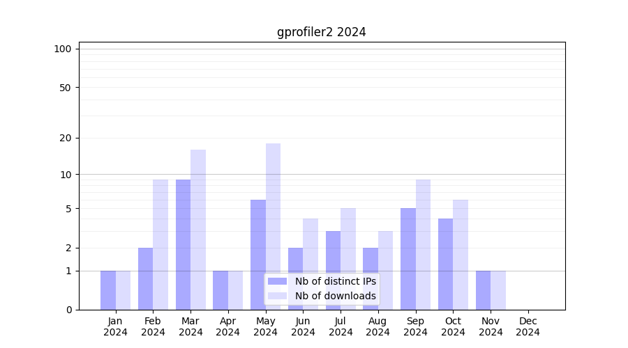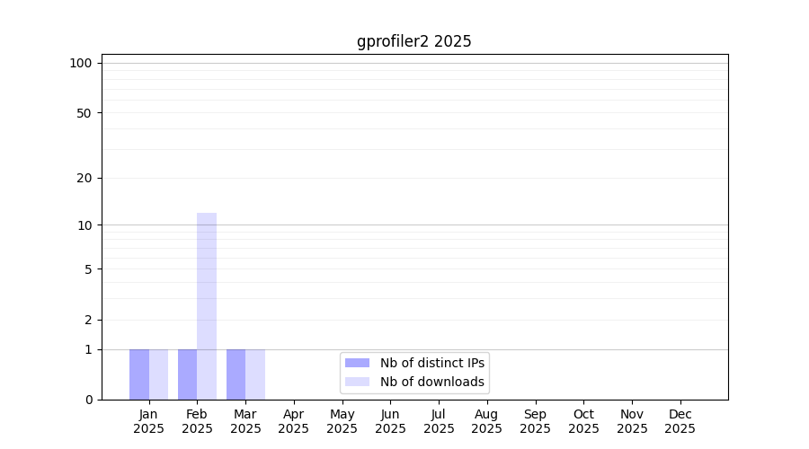 Number of downloads for annotation package gprofiler2, year by year, from 2025 back to 2014 (years with no downloads are omitted):