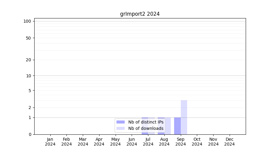 Number of downloads for annotation package grImport2, year by year, from 2025 back to 2014 (years with no downloads are omitted):