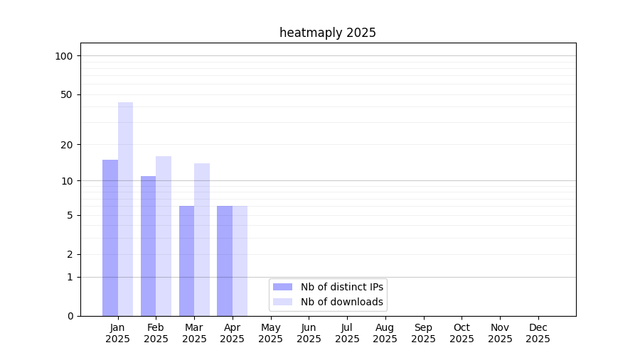 Number of downloads for annotation package heatmaply, year by year, from 2025 back to 2014 (years with no downloads are omitted):