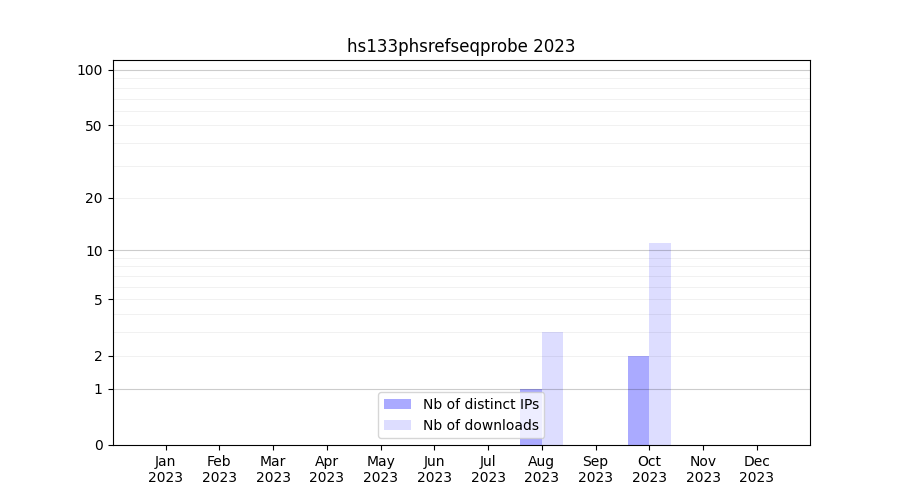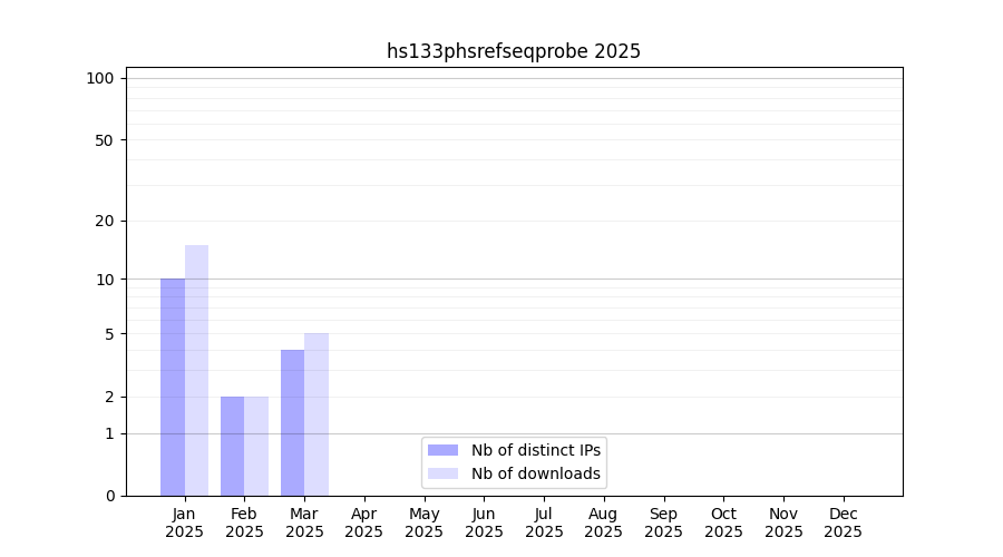 Number of downloads for annotation package hs133phsrefseqprobe, year by year, from 2025 back to 2014 (years with no downloads are omitted):