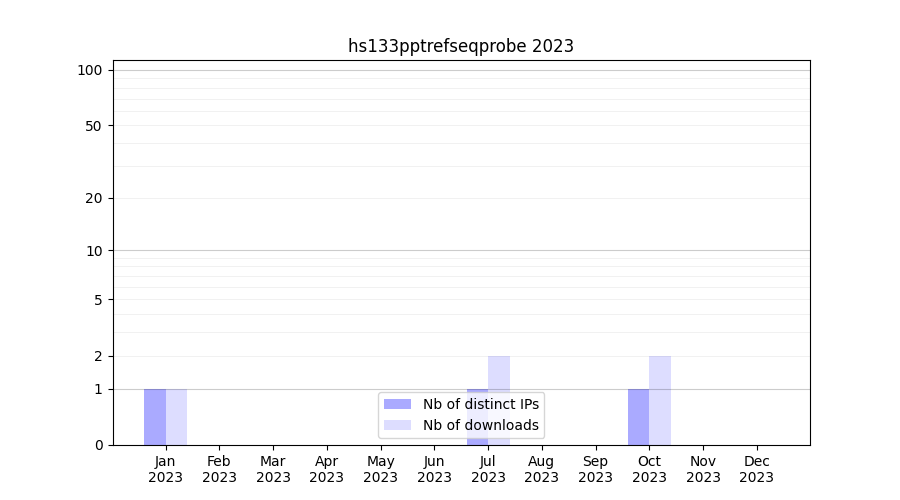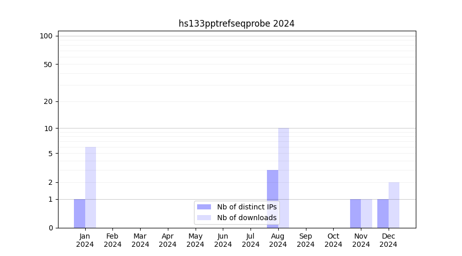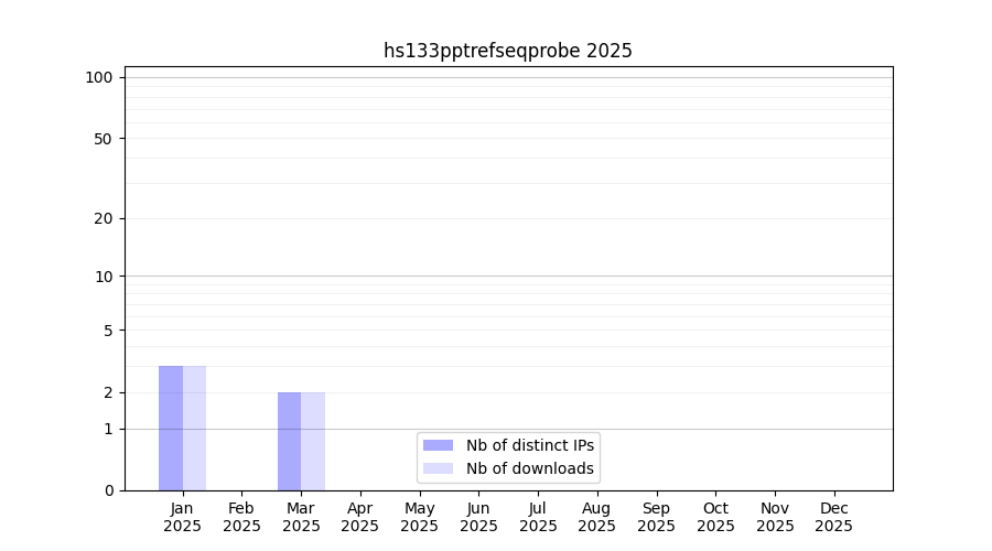 Number of downloads for annotation package hs133pptrefseqprobe, year by year, from 2025 back to 2014 (years with no downloads are omitted):