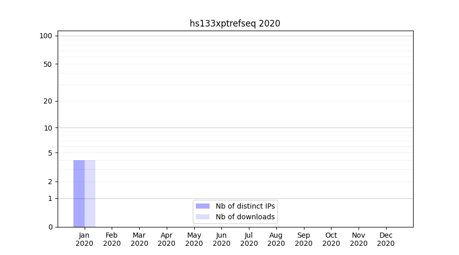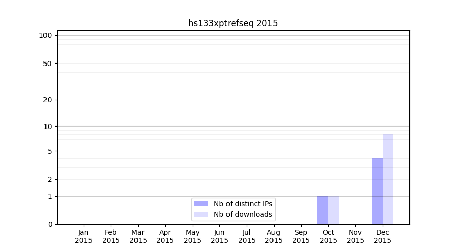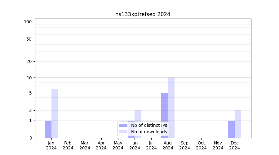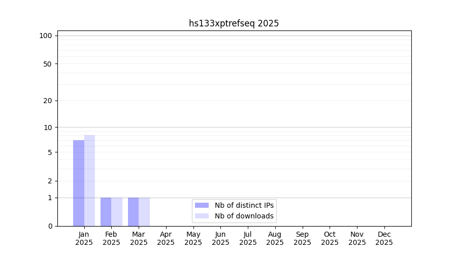 Number of downloads for annotation package hs133xptrefseq, year by year, from 2025 back to 2014 (years with no downloads are omitted):