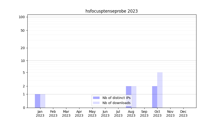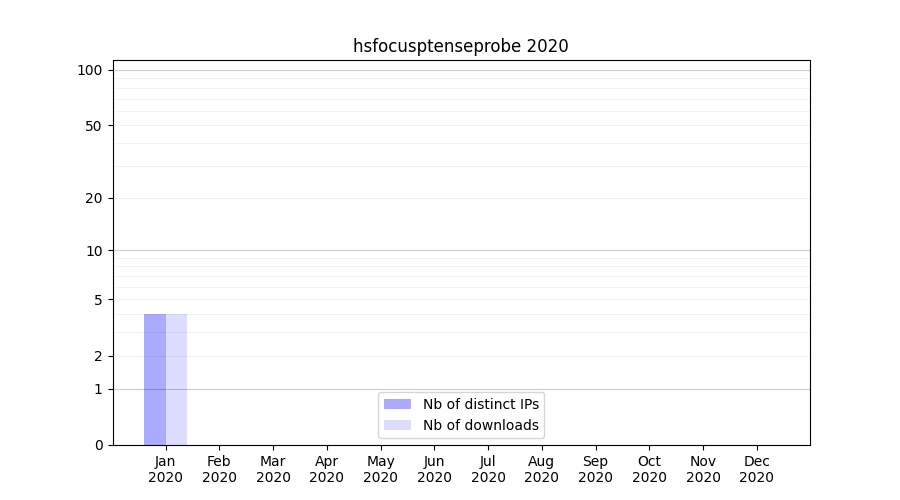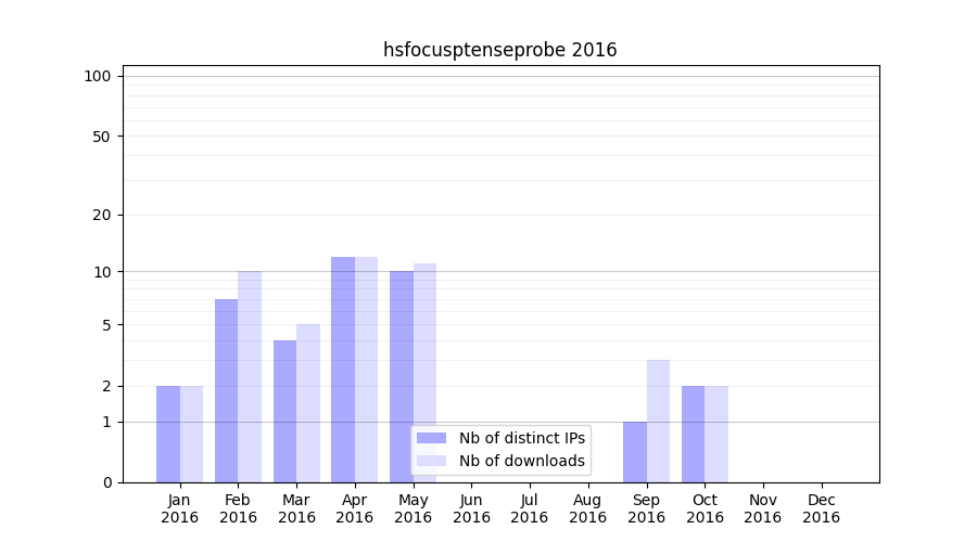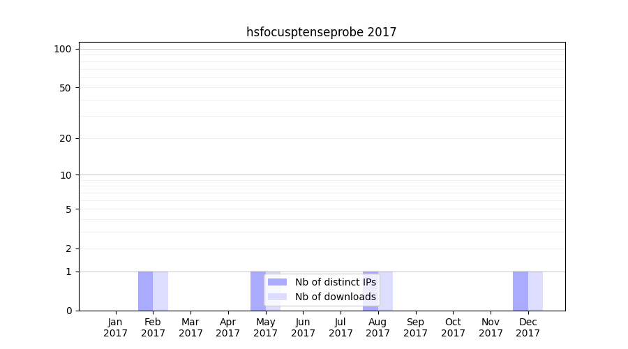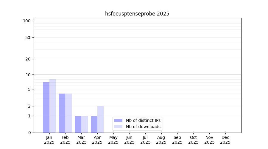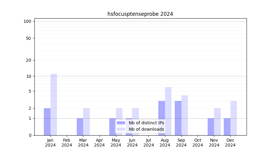 Number of downloads for annotation package hsfocusptenseprobe, year by year, from 2025 back to 2014 (years with no downloads are omitted):