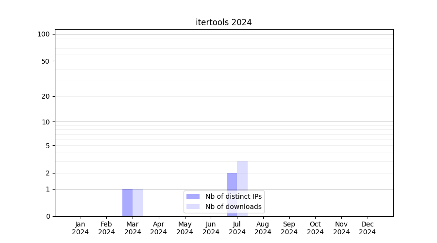 Number of downloads for annotation package itertools, year by year, from 2025 back to 2014 (years with no downloads are omitted):